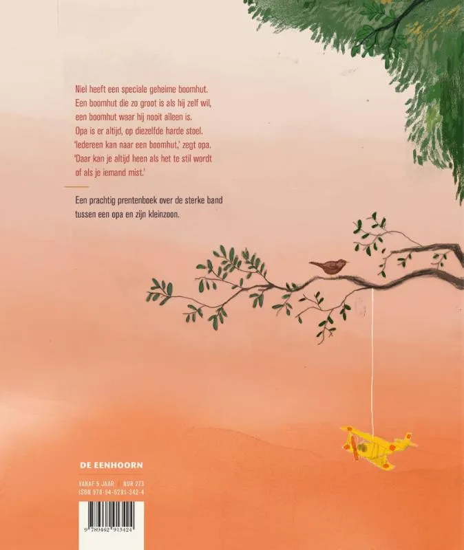 Niel heeft een speciale geheime boomhut. Een boomhut waar hij niet meer alleen is. Opa zit er altijd, op die harde stoel, nooit op de zachte bank. Samen maken ze de beste kampvuren van het bos. ‘Je kan hier altijd heenkomen als het te stil wordt of als je iemand mist,’ fluistert opa.