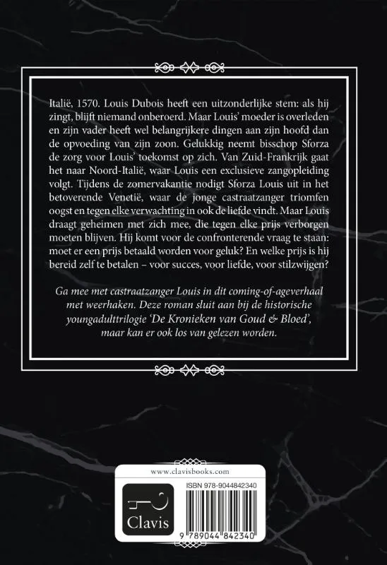 Ga mee met castraatzanger Louis in dit coming-of-ageverhaal met weerhaken. Deze roman sluit aan bij de historische youngadulttrilogie ‘De Kronieken van Goud & Bloed’, maar kan er ook los van gelezen worden.