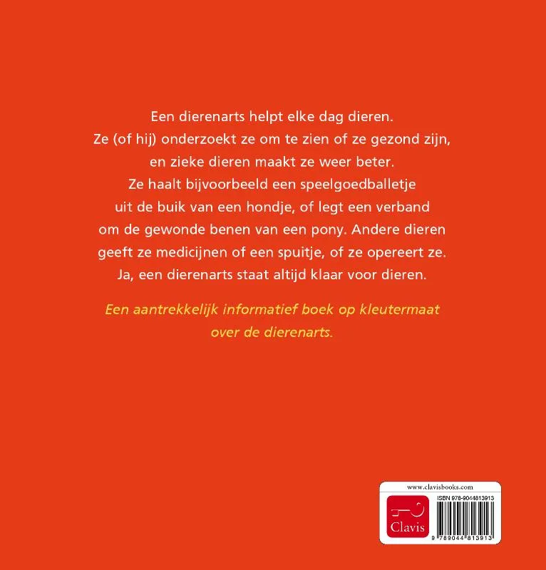 Een dierenarts helpt elke dag dieren. Ze (of hij) onderzoekt ze om te zien of ze gezond zijn, en zieke dieren maakt ze weer beter. Ze haalt bijvoorbeeld een speelgoedballetje uit de buik van een hondje, of legt een verband om de gewonde poten van een pony. Andere dieren geeft ze medicijnen of een spuitje, of ze opereert ze. Ja, een dierenarts staat altijd klaar voor dieren.