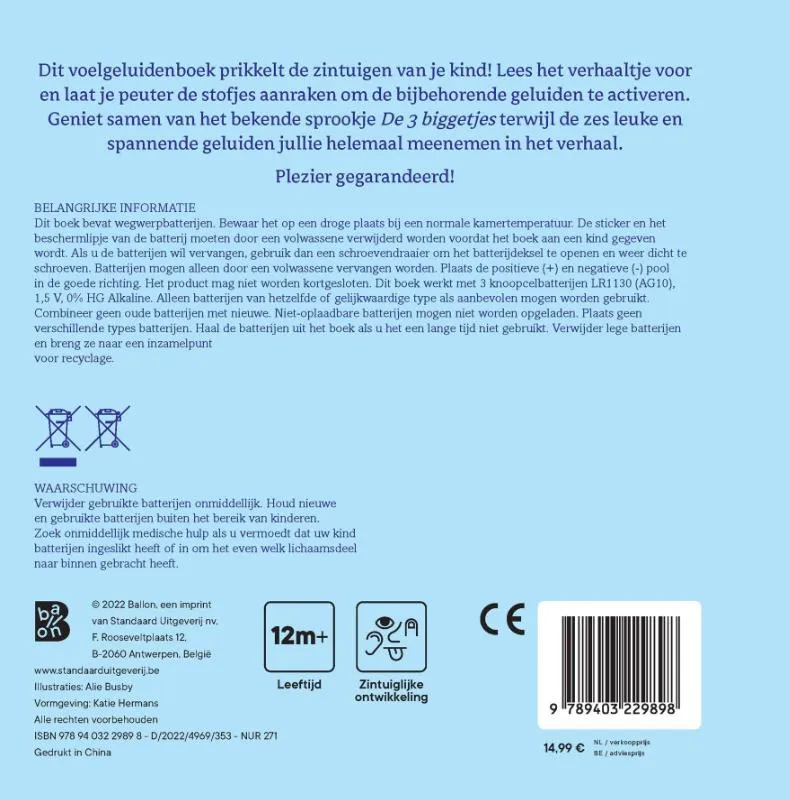 Geniet samen van het bekende sprookje De 3 biggetjes terwijl de zes leuke en spannende geluiden jullie helemaal meenemen in het verhaal.Dit voelgeluidenboek prikkelt de zintuigen van je kind! Lees het verhaaltje voor en laat je peuter de stofjes aanraken om de bijbehorende geluiden te activeren.Plezier gegarandeerd!
