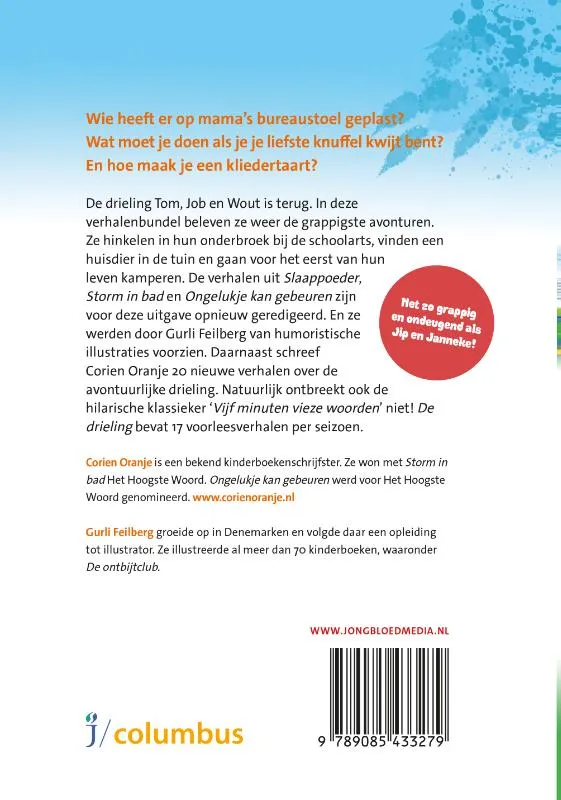 De drieling Tom, Job en Wout is terug. In deze verhalenbundel beleven ze weer de grappigste avonturen. Ze hinkelen in hun onderbroek bij de schoolarts, vinden een huisdier in de tuin en gaan voor het eerst van hun leven kamperen. De verhalen uit Slaappoeder, Storm in bad en Ongelukje kan gebeuren zijn voor deze uitgave opnieuw geredigeerd. En ze werden door Gurli Feilberg van humoristische illustraties voorzien. Daarnaast schreef Corien Oranje 20 nieuwe verhalen over de avontuurlijke drieling. Natuurlijk ontbreekt ook de hilarische klassieker ‘Vijf minuten vieze woorden’ niet! De drieling bevat 17 voorleesverhalen per seizoen.