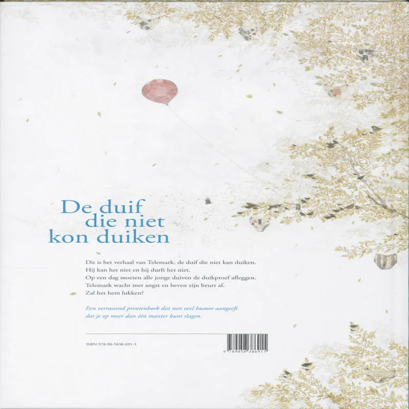 Een grappig verhaal met duiven in de hoofdrol, met herkenbare problemen voor kinderen. Debuut van een beloftevolle illustrator. Vanaf 6 jaar. Het is de dag van het afduiken. De jonge duiven zitten in de dakgoot en duiken een na een naar beneden. Ze moeten naast de tafels landen en een kruimel oppikken. Op de geveltribune zitten de vaderdoffers en moederduiven toe te kijken. En ’s avonds is er een groot feest. Maar niet voor Telemark! Hij heeft nog nooit een goede duikvlucht gemaakt. Met een bang hartje wacht hij zijn beurt af. Hij krijgt vast en zeker een nul! Of toch niet?