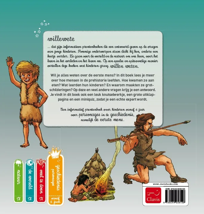 Een informatief prentenboek voor kinderen vanaf 6 jaar over personages in de geschiedenis, namelijk de eerste mens. Willewete… dat zijn informatieve prentenboeken die een antwoord geven op de vragen van jonge kinderen. Sommige onderwerpen staan dicht bij hen, andere een beetje verder. Ze gaan over de wereld en de natuur om ons heen, over het leven in het verleden en het leven nu. Op een speelse en spitsvondige manier vertellen deze boeken wat kinderen graag willen weten. Wil je alles weten over de eerste mens? In dit boek lees je meer over hoe mensen in de prehistorie leefden. Hoe kwamen ze aan eten? Wat leerden hun kinderen? En waarom maakten ze grotschilderingen? Op deze en veel andere vragen krijg je een antwoord. Je vindt in dit boek ook een leuk knutselwerkje, een grote uitklap-pagina en een miniquiz, zodat je een echte expert wordt.