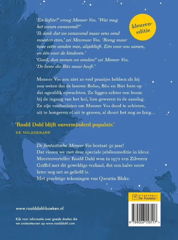 Prachtige jubileumeditie in kleur van De fantastische Meneer Vos , een fantastisch kinderboek van bestsellerauteur Roald Dahl. Met leeslint en tekeningen van bekroond illustrator Quentin Blake. Het boek won in 1972 een Zilveren Griffel.<br><br>‘En liefste?’ vroeg Meneer Vos. ‘Wat mag het wezen vanavond?’<br>‘Ik denk dat we vanavond maar eens eend moesten eten,’ zei Mevrouw Vos. ‘Breng maar twee vette eenden mee, alsjeblieft. Eén voor ons samen, en één voor de kinderen.’<br>‘Goed, dan nemen we eenden!’ zei Meneer Vos. ‘De beste die Bits maar heeft.’<br><br>Meneer Vos zou niet zoveel praatjes hebben als hij had geweten dat de boeren Bolus, Bits en Biet hem op dat ogenblik opwachten. Ze liggen achter een boom bij de ingang van het hol met een geladen geweer in de aanslag. Ze zijn vastbesloten om Meneer Vos dood te schieten, uit te hongeren of uit te graven, al duurt het nog zo lang…<br><br>‘Roald Dahl is de beste kinderboekenschrijver ter wereld.’ – VPRO-gids