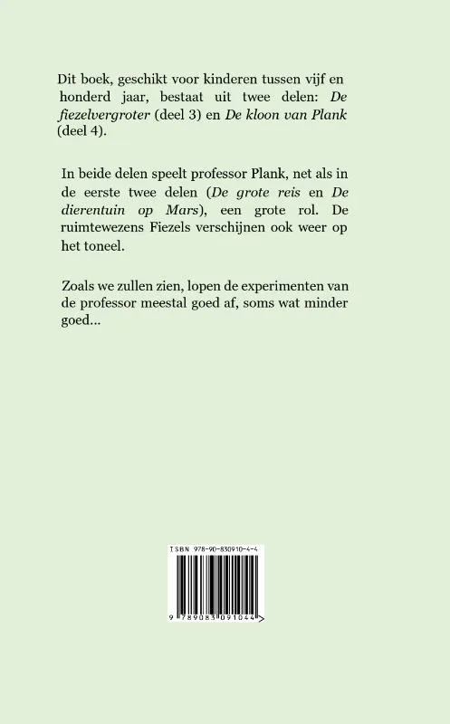 Dit boek, geschikt voor kinderen tussen vijf en honderd jaar, bestaat uit twee delen: De fiezelvergroter (deel 3) en De kloon van Plank (deel 4).