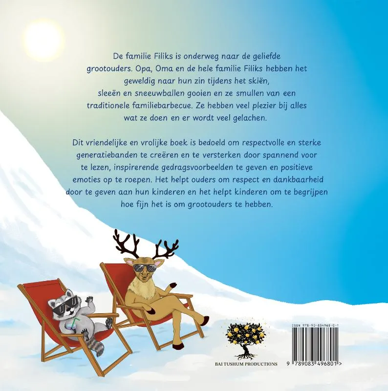 De familie Filiks is onderweg naar de geliefde grootouders. Opa, Oma en de hele familie Filiks hebben het geweldig naar hun zin tijdens het skiën, sleeën en sneeuwballen gooien en ze smullen van een traditionele familiebarbecue. Ze hebben veel plezier bij alles wat ze doen en er wordt veel gelachen.Dit vriendelijke en vrolijke boek is bedoeld om respectvolle en sterke generatiebanden te creëren en te versterken door spannend voor te lezen, inspirerende gedragsvoorbeelden te geven en positieve emoties op te roepen. Het helpt ouders om respect en dankbaarheid door te geven aan hun kinderen en het helpt kinderen om te begrijpen hoe fijn het is om grootouders te hebben.