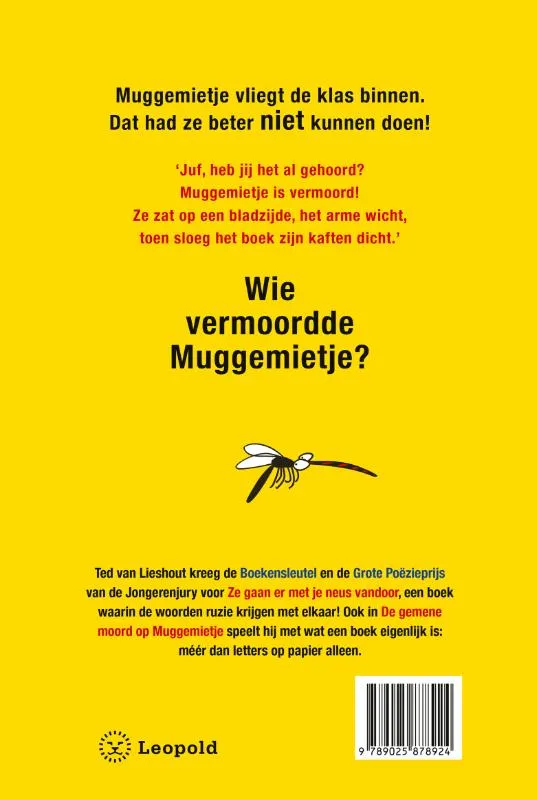 Ted van Lieshout kreeg de Boekensleutel en de Grote Poëzieprijs van de Jongerenjury voor Ze gaan er met je neus vandoor, een boek waarin de woorden ruzie krijgen met elkaar! Ook in De gemene moord op Muggemietje speelt hij met wat een boek eigenlijk is: méér dan letters op papier alleen.
