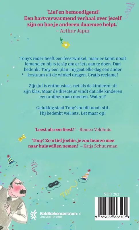De geniale avonturen van Tony Confetti is een boek vol kostuums en lef. Tony bedenkt een plan om de feestwinkel van zijn sippe vader uit het slop te helpen: hij draagt iedere dag een ander kostuum. Gratis reclame! Zijn juf is enthousiast, maar de schooldirecteur vindt dat alle kinderen er hetzelfde uit moeten zien en dus een uniform moeten dragen. Wat nu?