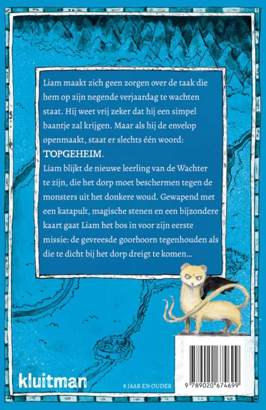 staat. Hij weet vrij zeker dat hij een simpel baantje zal krijgen. Maar als hij de envelop openmaakt, staat er slechts één woord: TOPGEHEIM. Liam blijkt de nieuwe leerling van de Wachter te zijn, die het dorp moet beschermen tegen de monsters uit het donkere woud. Gewapend met een katapult, magische stenen en een bijzondere kaart gaat Liam het bos in voor zijn eerste missie: de gevreesde goorhoorn tegenhouden als die te dicht bij het dorp dreigt te komen…