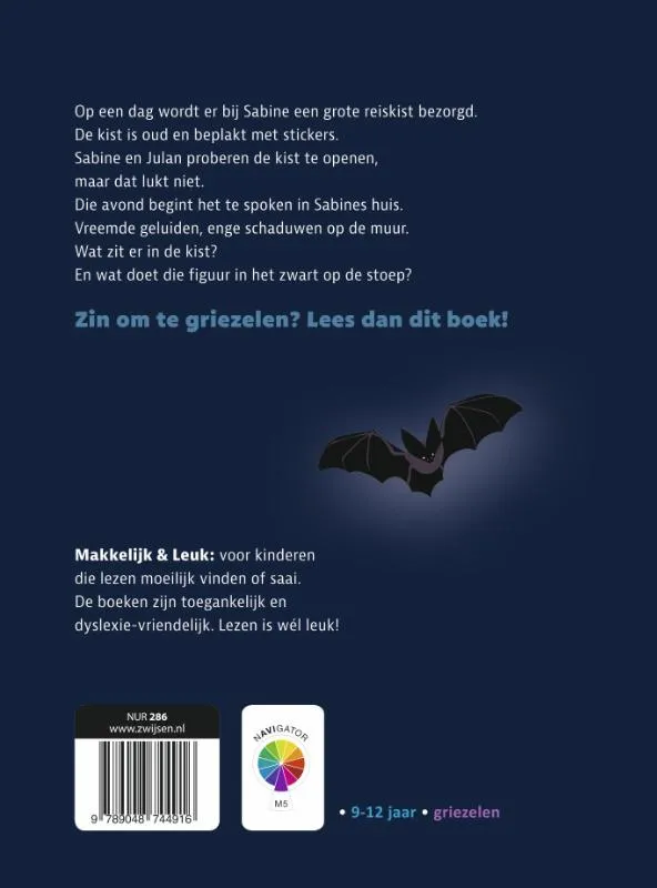 Er staat opeens een grote kist voor de deur van Sabine. Net als haar ouders een dagje weg zijn. Dit griezelboek is op AVI M5 en voor kinderen van 9-12 jaar. De serie ‘Makkelijk & Leuk’ is voor kinderen die lezen moeilijk vinden of saai. Zo krijgen kinderen weer plezier in lezen. Dyslexievriendelijk!<br><br>Op een dag staat bij Sabine een grote reiskist voor de deur.<br>De kist is oud en beplakt met stickers.<br>Sabine en Julan proberen de kist te openen,<br>maar dat lukt niet.<br>Die avond begint het te spoken in Sabines huis.<br>Vreemde geluiden, enge schaduwen op de muur.<br>Wat zit er in de kist?<br>En wat doet die figuur in het zwart op de stoep?