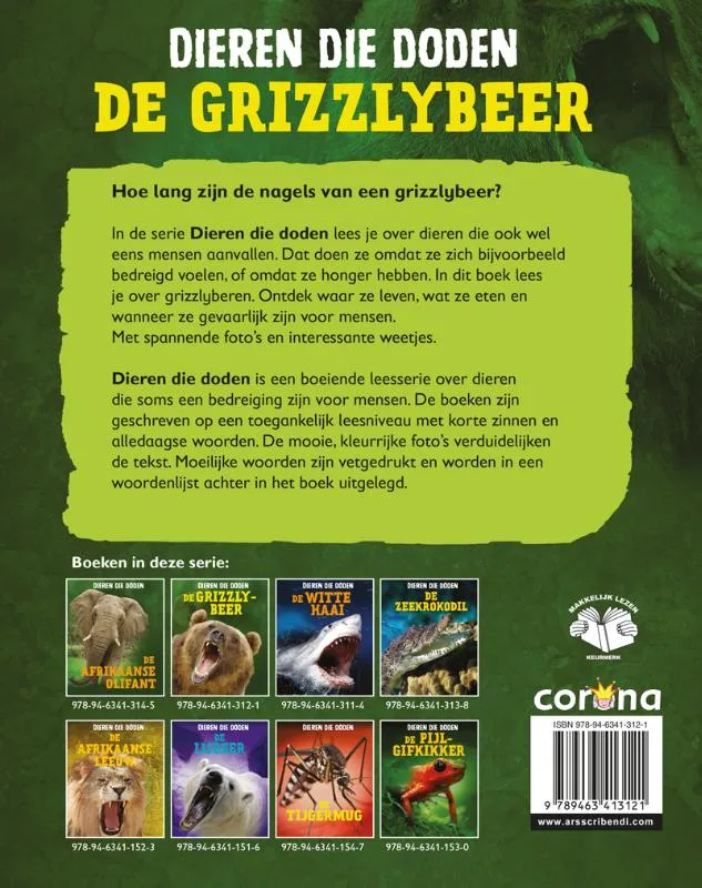 In de serie Dieren die doden lees je over dieren die ook wel eens mensen aanvallen. Dat doen ze omdat ze zich bijvoorbeeld bedreigd voelen, of omdat ze honger hebben. In dit boek lees je over grizzlyberen. Ontdek waar ze leven, wat ze eten en wanneer ze gevaarlijk zijn voor mensen. Met spannende foto’s en interessante weetjes.