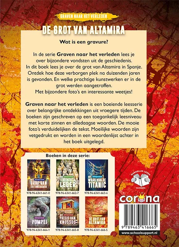 In de serie Graven naar het verleden lees je over bijzondere vondsten uit de geschiedenis. In dit boek lees je over de grot van Altamira in Spanje. Ontdek hoe deze verborgen plek na duizenden jaren is gevonden. En welke prachtige kunstwerken er in de grot werden aangetroffen. Met bijzondere foto’s en interessante weetjes! Graven naar het verleden is een boeiende leesserie over belangrijke ontdekkingen uit vroegere tijden. De boeken zijn geschreven op een toegankelijk leesniveau met korte zinnen en alledaagse woorden. De mooie foto’s verduidelijken de tekst. Moeilijke woorden zijn vetgedrukt en worden in een woordenlijst achter in het boek uitgelegd.