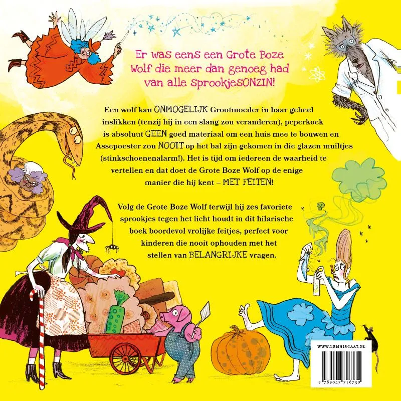 Een wolf kan ONMOGELIJK Grootmoeder in haar geheel inslikken (tenzij hij in een slang zou veranderen), peperkoek is absoluut GEEN goed materiaal om een huis mee te bouwen en Assepoester zou NOOIT op het bal zijn gekomen in die glazen muiltjes (stinkschoenenalarm!). Het is tijd om iedereen de waarheid te vertellen en dat doet de Grote Boze Wolf op de enige manier die hij kent – met FEITEN!