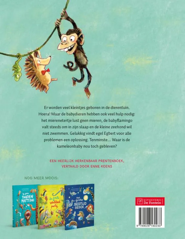 Er worden veel kleintjes geboren in de dierentuin. Hoera! Maar de babydieren hebben ook veel hulp nodig: het mierenetertje lust geen mieren, de babyflamingo valt steeds om in zijn slaap en de kleine zeehond wil niet zwemmen. Gelukkig vindt egel Egbert voor alle problemen een oplossing. Tenminste… Waar is de kameleonbaby nou toch gebleven?