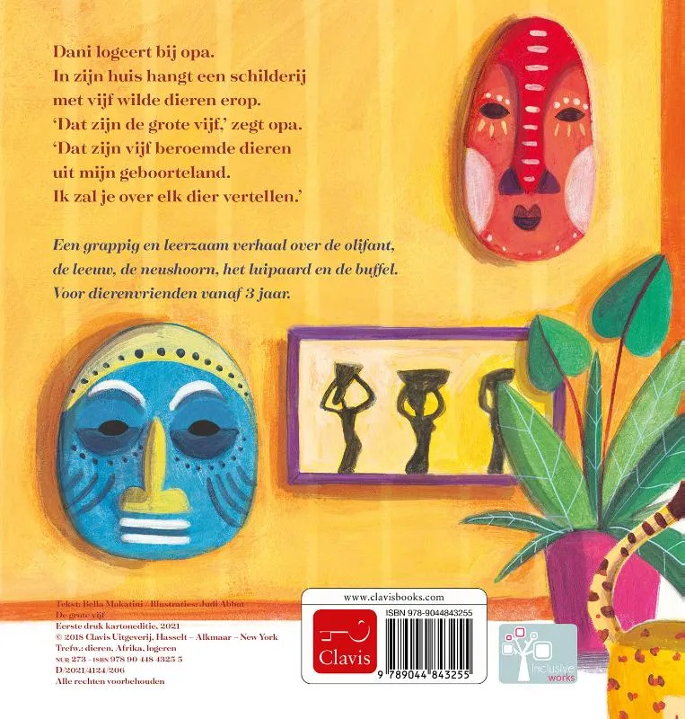 Dani logeert bij opa. In zijn huis hangt een schilderij met vijf wilde dieren erop. ‘Dat zijn de grote vijf,’ zegt opa. ‘Dat zijn vijf beroemde dieren uit mijn geboorteland. Ik zal je over elk dier vertellen.’