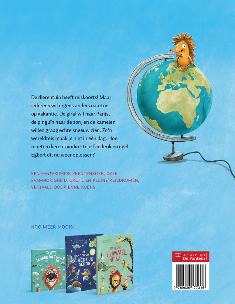 De dierentuin heeft reiskoorts! Maar iedereen wil ergens anders naartoe op vakantie. De giraf wil naar Parijs, de pinguïn naar de zon, en de kamelen willen graag echte sneeuw zien. Zo'n wereldreis maak je niet in één dag. Hoe moeten dierentuindirecteur Diederik en egel Egbert dit nu weer oplossen?<br><br> Een fantasierijk prentenboek, over saamhorigheid, grote en kleine reisdromen,<br> vertaald door Enne Koens