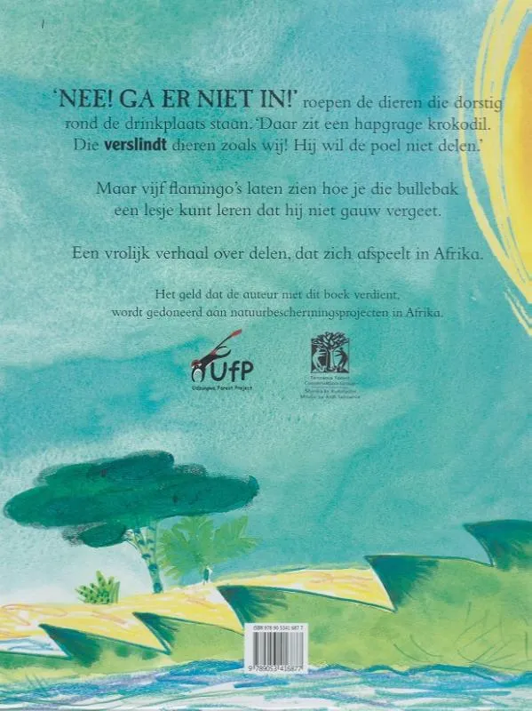 ‘NEE! GA ER NIET IN!’ roepen de dieren die dorstig rond de drinkplaats staan. ‘Daar zit een hapgrage krokodil. Die verslindt dieren zoals wij! Hij wil de poel niet delen.’