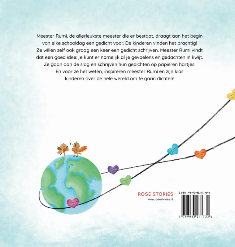 Meester Rumi, de allerleukste meester die er bestaat, draagt aan het begin van elke schooldag een gedicht voor. De kinderen vinden het prachtig! Ze willen zelf ook graag een keer een gedicht schrijven. Meester Rumi vindt dat een goed idee: je kunt er namelijk al je gevoelens en gedachten in kwijt. Ze gaan aan de slag en schrijven hun gedichten op papieren hartjes. En voor ze het weten, inspireren meester Rumi en zijn klas kinderen over de heel wereld om te gaan dichten!