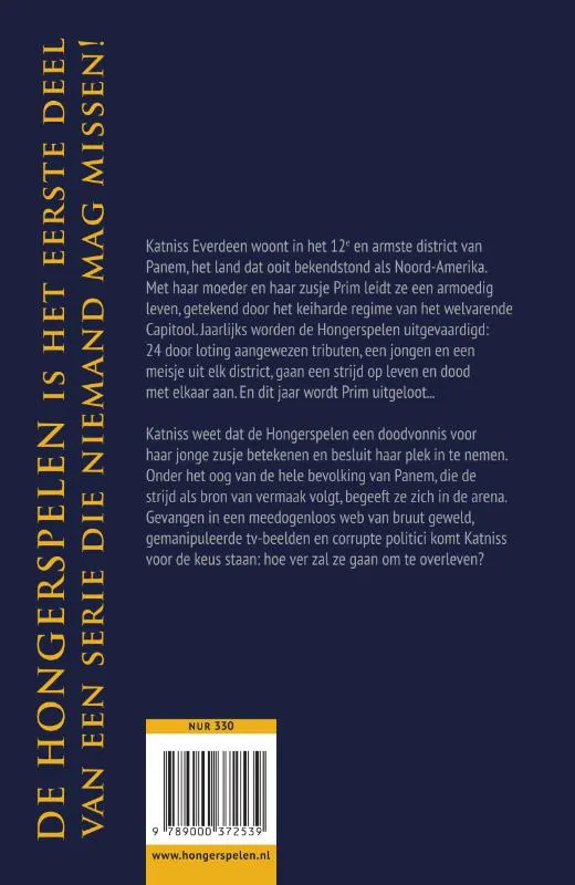 Katniss Everdeen woont in het 12e en armste district van Panem, het land dat ooit bekendstond als Noord-Amerika. Met haar moeder en haar zusje Prim leidt ze een armoedig leven, getekend door het keiharde regime van het welvarende Capitool. Jaarlijks worden de Hongerspelen uitgevaardigd: 24 door loting aangewezen tributen, een jongen en een meisje uit elk district, gaan een strijd op leven en dood met elkaar aan. En dit jaar wordt Prim uitgeloot…