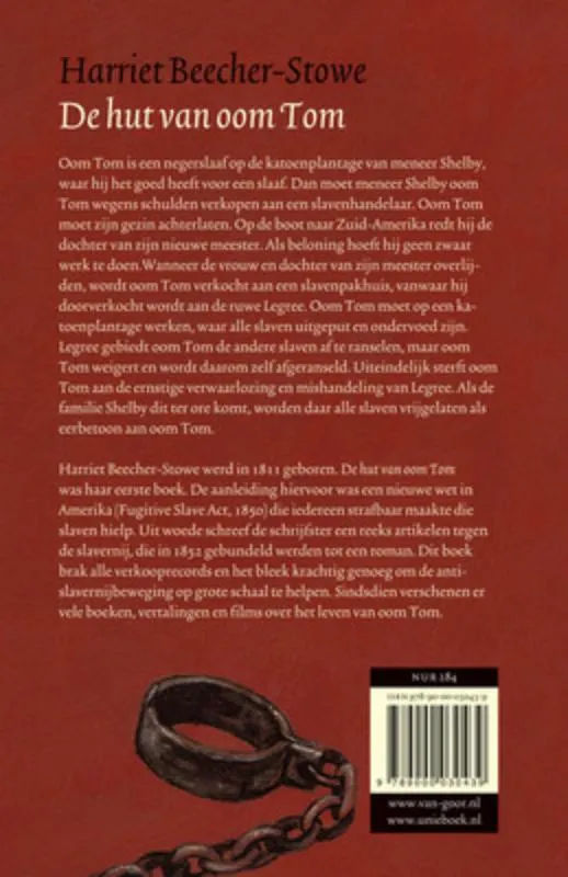 Harriet Beecher-Stowe werd in 1811 geboren. De hut van oom Tom was haar eerste boek. De aanleiding hiervoor was een nieuwe wet in Amerika (Fugitive Slave Act, 1850) die iedereen strafbaar maakte die slaven hielp. Uit woede schreef de schrijfster een reeks artikelen tegen de slavernij, die in 1852 gebundeld werden tot een roman. Dit boek brak alle verkooprecords en het bleek krachtig genoeg om de anti-slavernijbeweging op grote schaal te helpen. Sindsdien verschenen er vele boeken, vertalingen en films over het leven van oom Tom.