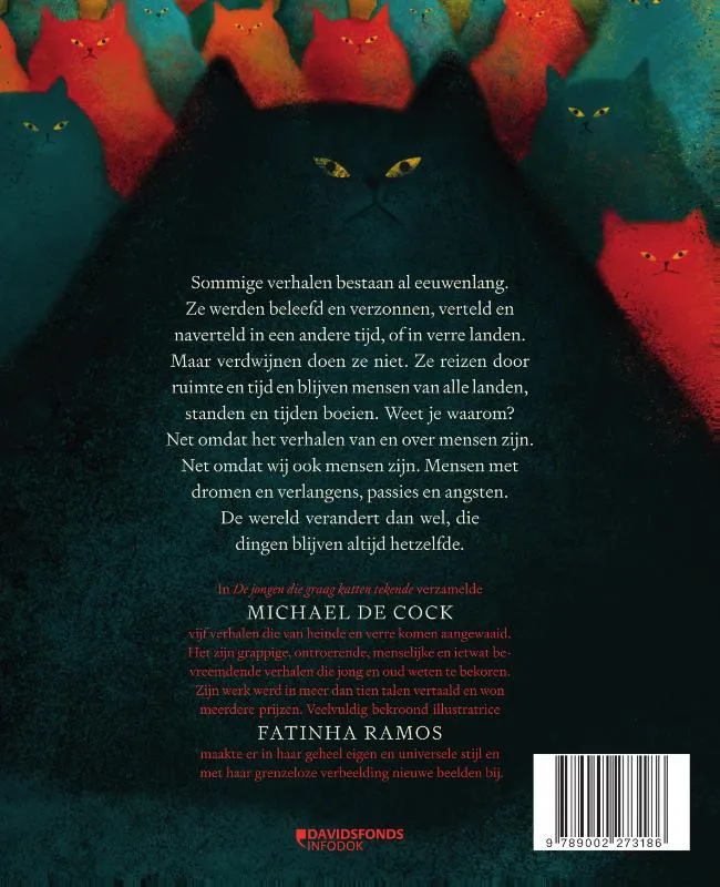 Sommige verhalen bestaan al eeuwenlang. Ze werden beleefd en verzonnen, verteld en naverteld in een andere tijd, of in verre landen. Maar verdwijnen doen ze niet. Ze reizen door ruimte en tijd en blijven mensen van alle landen, standen en tijden boeien. Weet je waarom? Net omdat het verhalen van en over mensen zijn. Net omdat wij ook mensen zijn. Mensen met dromen en verlangens, passies en angsten. De wereld verandert dan wel, die dingen blijven altijd hetzelfde. In De jongen die graag katten tekende verzamelde Michael De Cock vijf verhalen die van heinde en verre komen aangewaaid. Het zijn grappige, ontroerende, menselijke en ietwat bevreemdende verhalen die jong en oud weten te bekoren. Zijn werk werd in meer dan tien talen vertaald en won meerdere prijzen. Veelvuldig bekroond illustratrice Fatinha Ramos maakte er in haar geheel eigen en universele stijl en met haar grenzeloze verbeelding nieuwe beelden bij.