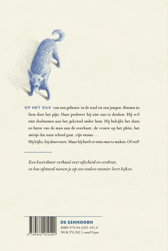 Op het dak van een gebouw in de stad zit een jongen. Binnen in hem doet het pijn. Daar probeert hij niet aan te denken. Hij wil niet deelnemen aan het gekrioel onder hem. Hij bekijkt het doen en laten van de man aan de overkant, de vrouw op het plein, het meisje dat naar school gaat, zijn mama … Hij kijkt, hij observeert. Maar hij heeft er niets mee te maken. Of toch?