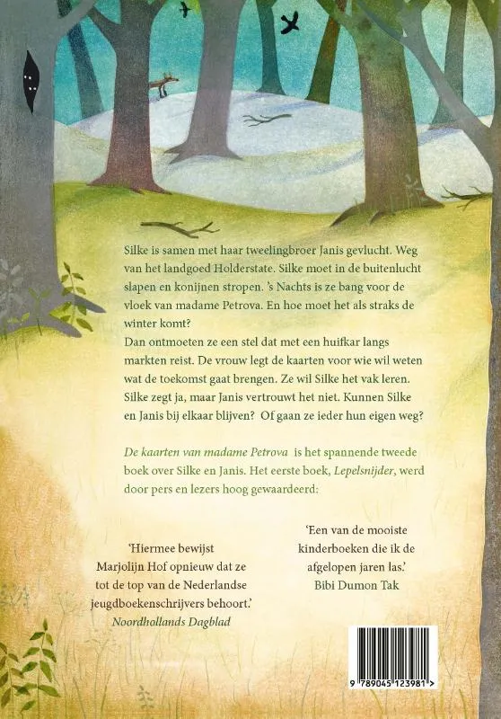 Silke is samen met haar tweelingbroer Janis gevlucht uit angst voor de voorspelling van waarzegster madame Petrova. Het valt haar zwaar om te slapen in de buitenlucht, konijnen te stropen, en vodden te dragen. En wat als straks de winter komt?<br><br>Dan doet zich een buitenkans voor. Ze ontmoeten een echtpaar dat met een huifkar langs markten reist. Zij legt de kaarten voor wie graag wil weten wat de toekomst gaat brengen en hij heeft een beer die kan dansen. Silke wil zich bij hen aansluiten, en leren hoe ze zelf kaarten kan leggen, misschien dat ze zo haar angst voor de voorspelling kan overwinnen. Maar Janis vertrouwt het niet. Hoe kan Silke hem overtuigen? Kunnen ze bij elkaar blijven of gaan ze ieder hun eigen weg?<br><br>De kaarten van madame Petrova is het spannende en sfeervolle vervolg op Lepelsnijder.<br><br>‘Een van de mooiste kinderboeken die ik de afgelopen jaren las.’ Bibi Dumon Tak over Lepelsnijder<br><br>‘Hiermee bewijst Marjolijn Hof opnieuw dat ze tot de top van de Nederlandse jeugdboekenschrijvers behoort.’ Noordhollands Dagblad