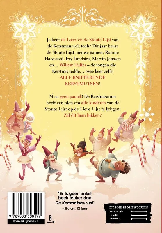 Je kent de Lieve en de Stoute Lijst van de Kerstman wel, toch? Dit jaar bevat de Stoute Lijst nieuwe namen: Ronnie Halvezool, Irry Tandstra, Marvin Janssen en… Willem Tuffer – de jongen die Kerstmis redde… twee keer zelfs! ALLE KNIPPERENDE KERSTMUTSEN! Maar geen paniek! De Kerstmisaurus heeft een plan om alle kinderen van de Stoute Lijst op de Lieve Lijst te krijgen. Zal dit hem lukken?