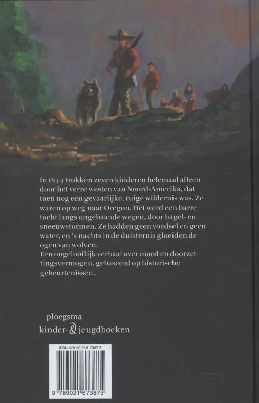 In 1844 trekken zeven kinderen helemaal alleen door het verre westen van Noord-Amerika, dat dan nog een gevaarlijke, ruige wildernis is. Ze zijn op weg naar Oregon. Het wordt een barre tocht langs ongebaande wegen, door hagel- en sneeuwstormen. Ze hebben geen voedsel en geen water, en ’s nachts in de duisternis gloeien de ogen van wolven…<br>