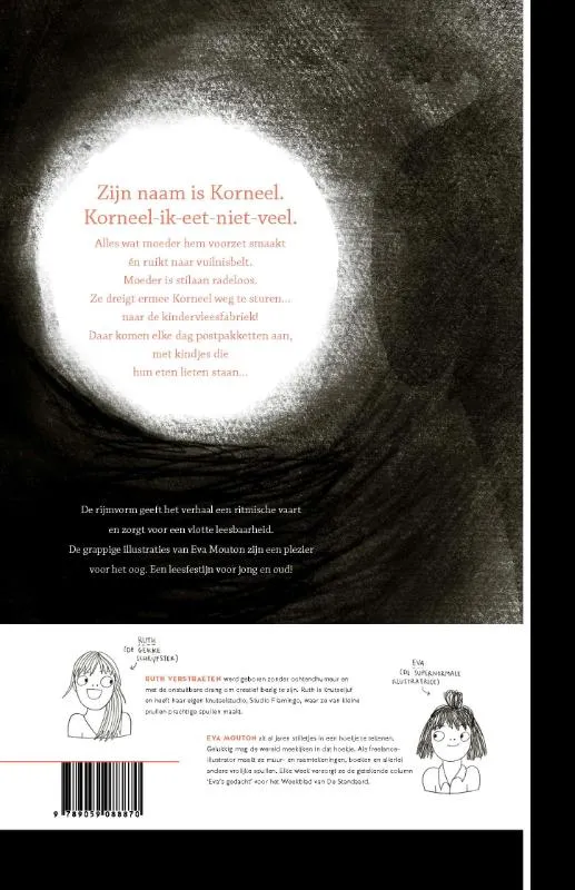 Zijn naam is Korneel.Korneel-ik-eet-niet-veel.Alles wat moeder hem voorzet smaaktén ruikt naar vuilnisbelt.Moeder is stilaan radeloos.Ze dreigt ermee Korneel weg te sturen…naar de kindervleesfabriek!Daar komen elke dag postpakketten aan,met kindjes diehun eten lieten staan…De rijmvorm geeft het verhaal een ritmische vaart en zorgt voor een vlotte leesbaarheid.De grappige illustraties van Eva Mouton zijn een plezier voor het oog. Een leesfestijn voor jong en oud!
