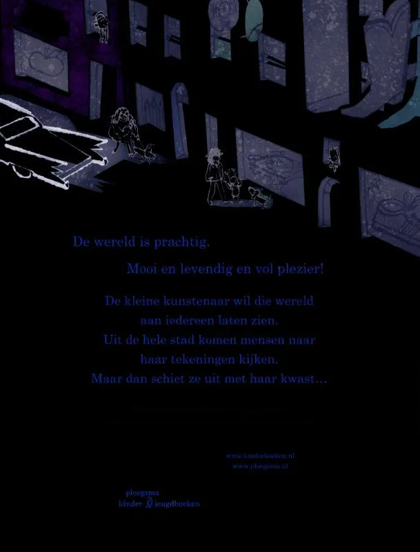 Het hoofd van de kleine kunstenaar zit vol met kleuren en dromen. Ze wil haar kunst aan de hele wereld laten zien, en reist naar een grote stad. Daar is alle ruimte om te tekenen, en ze maakt prachtige tekeningen op elk gebouw. Mensen komen van overal om ernaar te kijken, maar dan schiet ze uit met haar kwast…