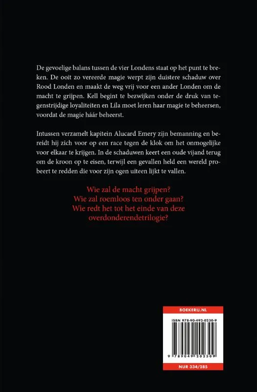 De gevoelige balans tussen de vier Londens staat op het punt te breken. De ooit zo vereerde magie werpt zijn duistere schaduw over Rood Londen en maakt de weg vrij voor een ander Londen om de macht te grijpen. Kell begint te bezwijken onder de druk van tegenstrijdige loyaliteiten en Lila moet leren haar magie te beheersen, voordat de magie háár beheerst.