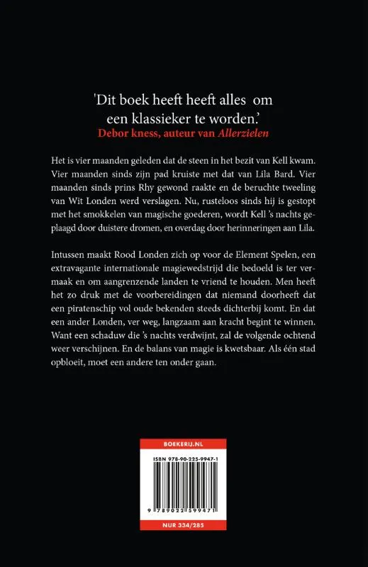 Intussen maakt Rood Londen zich op voor de Element Spelen, een extravagante internationale magiewedstrijd die bedoeld is ter vermaak en om aangrenzende landen te vriend te houden. Men heeft het zo druk met de voorbereidingen dat niemand doorheeft dat een piratenschip vol oude bekenden steeds dichterbij komt. En dat een ander Londen, ver weg, langzaam aan kracht begint te winnen. Want een schaduw die ’s nachts verdwijnt, zal de volgende ochtend weer verschijnen. En de balans van magie is kwetsbaar. Als één stad opbloeit, moet een andere ten onder gaan.