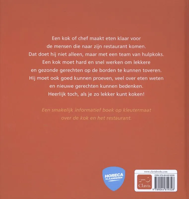 De kok maakt gezond en lekker eten klaar. Dat doet hij in een grote keuken, vaak in een restaurant. Iedere dag worden er verse groenten, vlees en vis geleverd. Alles wordt voorbereid en staat klaar. Als het restaurant dan opengaat, kan iedere klant kiezen uit de menukaart. De chef maakt samen met het hele keukenteam de gerechtjes klaar. Ieder heeft zijn taak, zodat het snel vooruit gaat. Alles wordt mooi op het bord gelegd, en het smaakt superlekker! Een smakelijk informatief boek op kleutermaat over de kok.