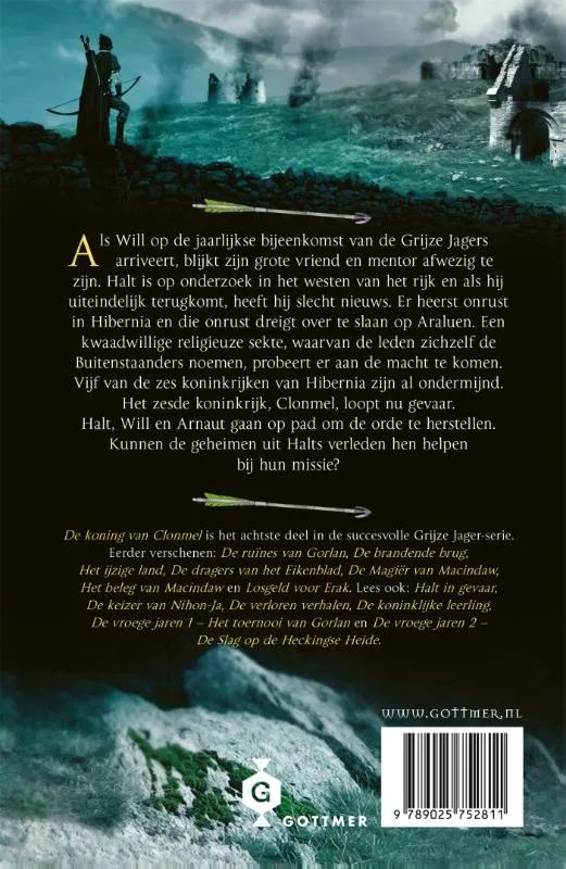 ‘De koning van Clonmel’ is deel 8 van de spannende internationale bestsellerserie ‘De Grijze Jager’ van John Flanagan. Alleen in Nederland en België zijn er van deze fantasyreeks al meer dan 1,5 miljoen boeken verkocht. <br><br>Als Will in ‘De koning van Clonmel’ op de jaarlijkse bijeenkomst van de Grijze Jagers arriveert, blijkt zijn grote vriend en mentor afwezig te zijn. Halt is op onderzoek in het westen van het rijk en als hij uiteindelijk terugkomt, heeft hij slecht nieuws. Er heerst onrust in Hibernia en die onrust dreigt over te slaan op Araluen. Een kwaadwillige religieuze sekte, waarvan de leden zichzelf de Buitenstaanders noemen, probeert er aan de macht te komen. Vijf van de zes koninkrijken van Hibernia zijn al ondermijnd. Het zesde koninkrijk, Clonmel, loopt nu gevaar. <br><br>Halt, Will en Arnaut gaan op pad om de orde te herstellen. Kunnen de geheimen uit Halts verleden hen helpen bij hun missie? Voor lezers vanaf 10 jaar.