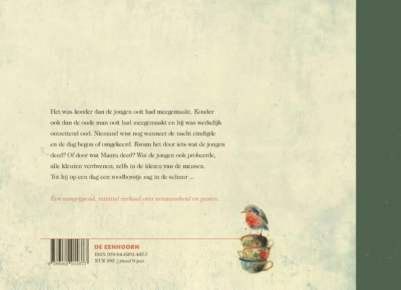 Het was kouder dan de jongen ooit had meegemaakt. Kouder ook dan de oude man ooit had meegemaakt en hij was werkelijk ontzettend oud. Niemand wist nog wanneer de nacht eindigde en de dag begon of omgekeerd. Kwam het door iets wat de jongen deed? Of door wat Maura deed? Wat de jongen ook probeerde, alle kleuren verdwenen, zelfs in de kleren van de mensen. Tot hij op een dag een roodborstje zag in de schuur …