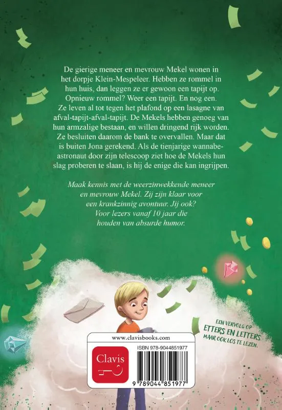 De gierige meneer en mevrouw Mekel wonen in het dorpje Klein-Mespeleer. Hebben ze rommel in hun huis, dan leggen ze er gewoon een tapijt op. Opnieuw rommel? Weer een tapijt. En nog een. Ze leven al tot tegen het plafond op een lasagne van afval-tapijt-afval-tapijt. De Mekels hebben genoeg van hun armzalige bestaan, en willen dringend rijk worden. Ze besluiten daarom de bank te overvallen. Maar dat is buiten Jona gerekend. Als de tienjarige wannabe-astronaut door zijn telescoop ziet hoe de Mekels hun slag proberen te slaan, is hij de enige die kan ingrijpen.