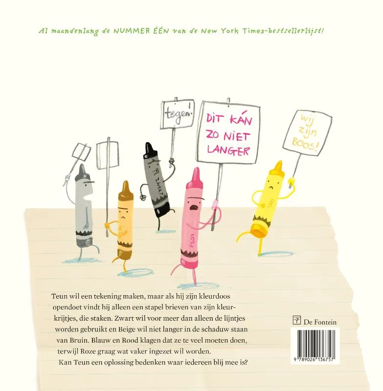 In De krijtjes staken van Drew Daywalt Oliver Jeffers heeft Teun een probleem. Hij wil een tekening maken, maar als hij zijn kleurdoos opendoet vindt hij daarin alleen een stapel brieven. De brieven komen van zijn kleurkrijtjes, die staken. Zwart wil voor meer dan alleen de lijntjes worden gebruikt en Beige wil niet meer in de schaduw staan van Bruin. Blauw heeft behoefte aan rust na alle rivieren, oceanen en luchten waaraan hij heeft meegewerkt. Ook Rood klaagt dat hij te veel moet doen, terwijl Roze juist graag eens wat vaker ingezet zou willen worden. Kan Teun zijn krijtjes kalmeren en een oplossing bedenken waar iedereen blij mee is?