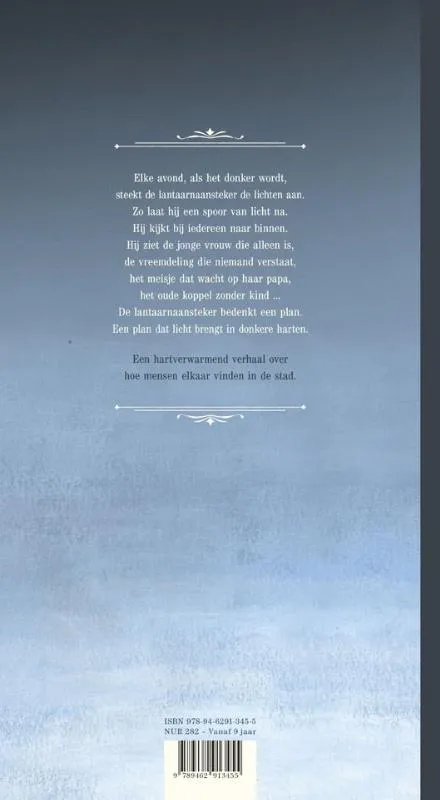 Elke avond, als het donker wordt, steekt de lantaarnaansteker de lichten aan. Zo laat hij een spoor van licht na. Hij kijkt bij iedereen naar binnen. Hij ziet de jonge vrouw die alleen is, de vreemdeling die niemand begrijpt, het meisje dat wacht op haar papa, het oude koppel zonder kind … De lantaarnaansteker bedenkt een plan. Een plan dat licht brengt in donkere harten.