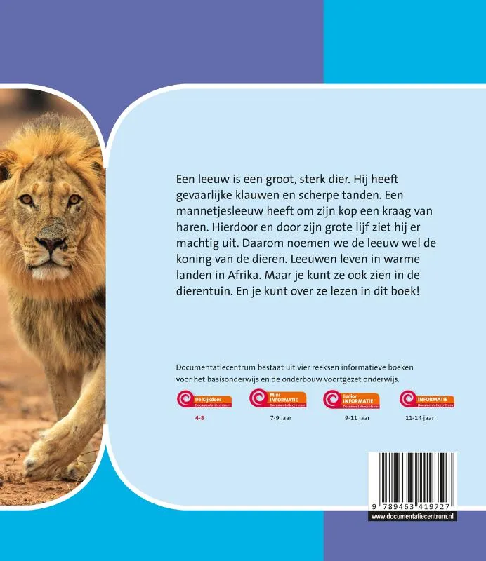 Een leeuw is een groot, sterk dier. Hij heeft gevaarlijke klauwen en scherpe tanden. Een mannetjesleeuw heeft om zijn kop een kraag van haren. Hierdoor en door zijn grote lijf ziet hij er machtig uit. Daarom noemen we de leeuw wel de koning van de dieren. Leeuwen leven in warme landen in Afrika. Maar je kunt ze ook zien in de dierentuin. En je kunt over ze lezen in dit boek!