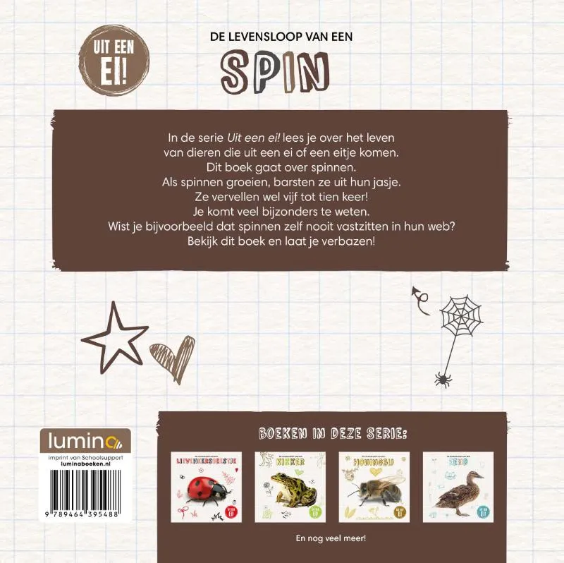In de serie Uit een ei! Lees je over het leven van dieren die uit een ei of een eitje komen. Dit boek gaat over spinnen. Als spinnen groeien, barsten ze uit hun jasje. Ze vervellen wel vijf tot tien keer! Je komt veel bijzonders te weten. Wist je bijvoorbeeld dat spinnen zelf nooit vastzitten in hun web? Bekijk dit boek en laat je verbazen!