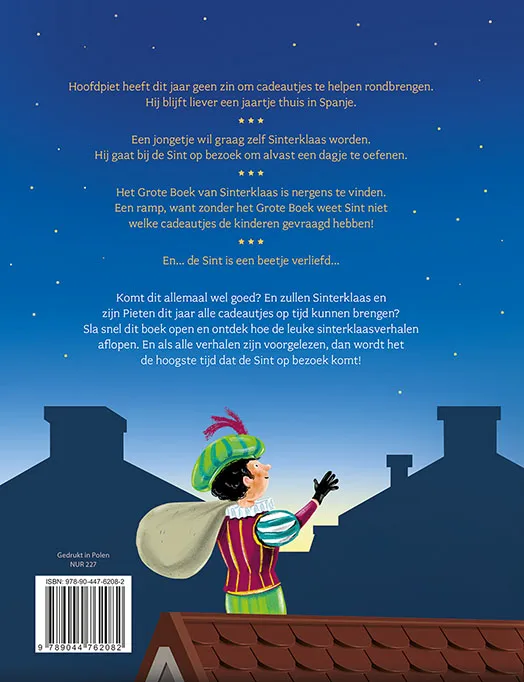 In dit leuke verhalenboek ontdek je de mooiste verhalen over Sinterklaas en zijn Pieten: – Hoofdpiet heeft geen zin om cadeautjes te helpen rondbrengen, dus hij blijft een keertje thuis; – een jongetje wil graag Sinterklaas worden en oefent alvast een dagje; – het Grote Boek van Sinterklaas is nergens te vinden, wat een ramp… – en de Sint is een beetje verliefd! Komt dit allemaal wel goed? Sla snel dit boek open en lees hoe de sinterklaasverhalen aflopen!