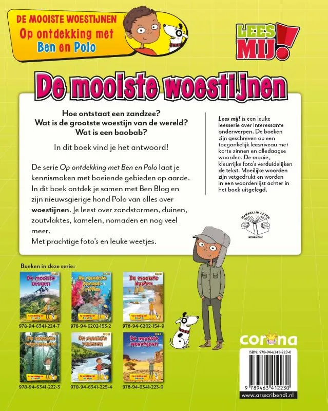 In dit boek ontdek je samen met Ben Blog en zijn nieuwsgierige hond Polo van alles over woestijnen. Je leest over zandstormen, duinen, zoutvlaktes, kamelen, nomaden en nog veel meer.