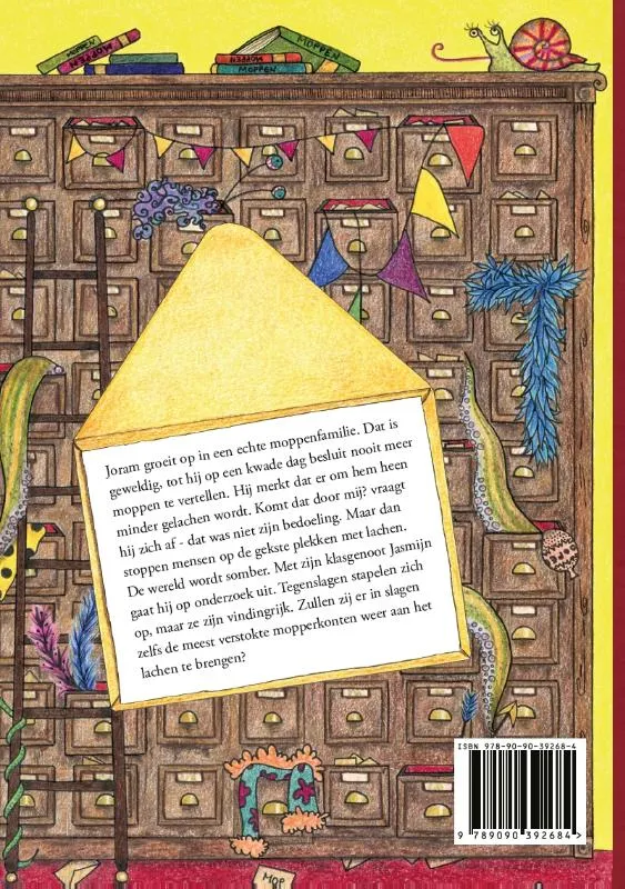 Joram groeit op in een echte moppenfamilie. Dat is geweldig, tot hij op een kwade dag besluit nooit meer moppen te vertellen. Hij merkt dat er om hem heen minder gelachen wordt. Komt dat door mij? vraagt hij zich af – dat was niet zijn bedoeling. Maar dan stoppen mensen op de gekste plekken met lachen. De wereld wordt somber. Met zijn klasgenoot Jasmijn gaat hij op onderzoek uit. Tegenslagen stapelen zich op, maar ze zijn vindingrijk. Zullen zij er in slagen zelfs de meest verstokte mopperkonten weer aan het lachen te brengen?