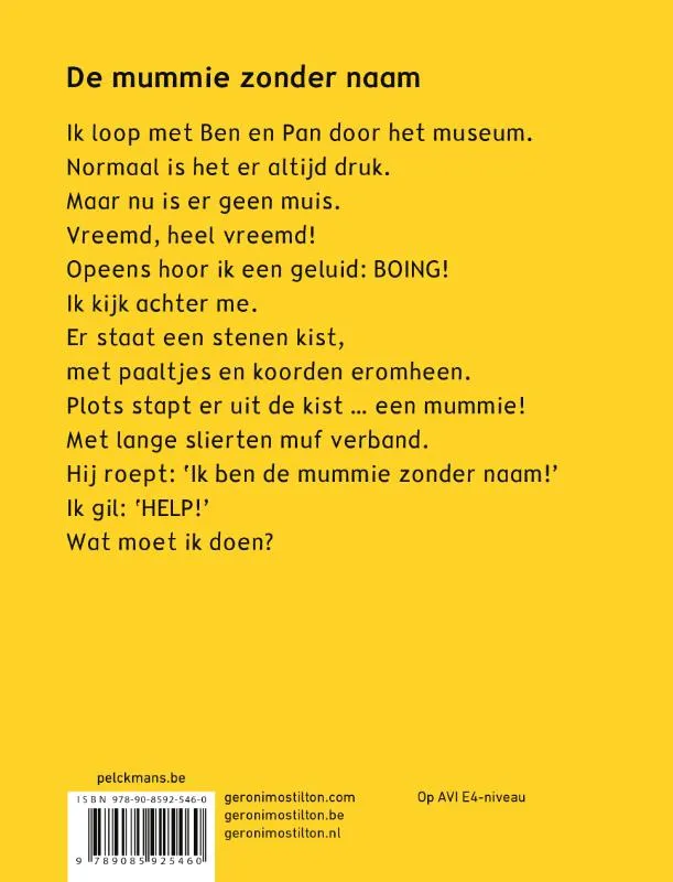 Geronimo loopt met Ben en Pan door het museum. Normaal is het er altijd druk. Maar nu is er geen muis. Vreemd, heel vreemd! Opeens hoort Geronimo een geluid: BOING! Hij kijkt achterom. Daar staat een stenen kist, met paaltjes en koorden eromheen. Plots stapt er uit de kist… een mummie! Met lange slierten beschimmeld verband. Hij roept: ‘Ik ben de mummie zonder naam!’ Geronimo roept: ‘HELP!’ Wat moet hij doen?