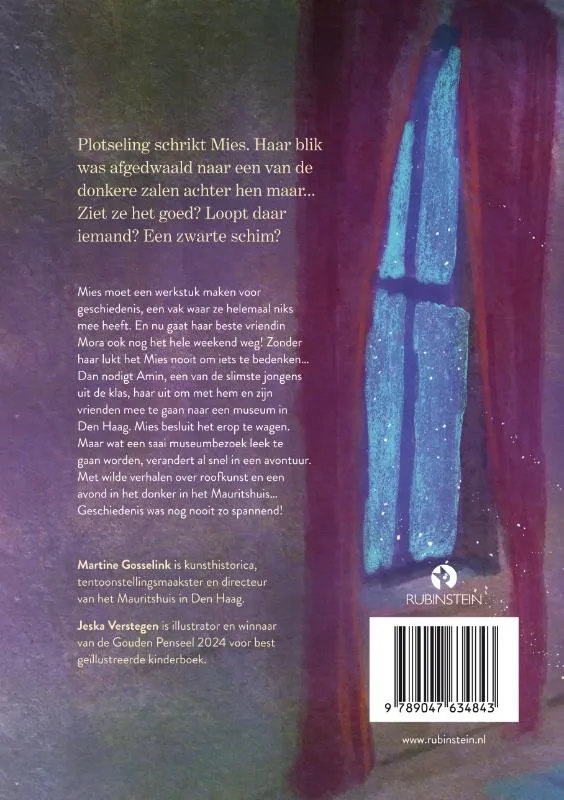 Plotseling schrikt Mies. Haar blik was afgedwaald naar een van de donkere zalen achter hen maar… Ziet ze het goed? Loopt daar iemand? Een zwarte schim? Mies moet een werkstuk maken voor geschiedenis, een vak waar ze helemaal niks mee heeft. En nu gaat haar beste vriendin Mora ook nog het hele weekend weg! Zonder haar lukt het Mies nooit om iets te bedenken… Dan nodigt Amin, een van de slimste jongens uit de klas, haar uit om met hem en zijn vrienden mee te gaan naar een museum in Den Haag. Mies besluit het erop te wagen. Maar wat een saai museumbezoek leek te gaan worden, verandert al snel in een avontuur. Met wilde verhalen over roofkunst en een avond in het donker in het Mauritshuis. Geschiedenis was nog nooit zo spannend!