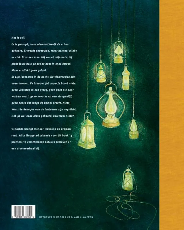 In de nacht brengt meneer Makkelie de dromen rond. Alice Hoogstad tekende voor dit boek 14 prenten, 13 verschillende auteurs schreven er een verhaal bij.