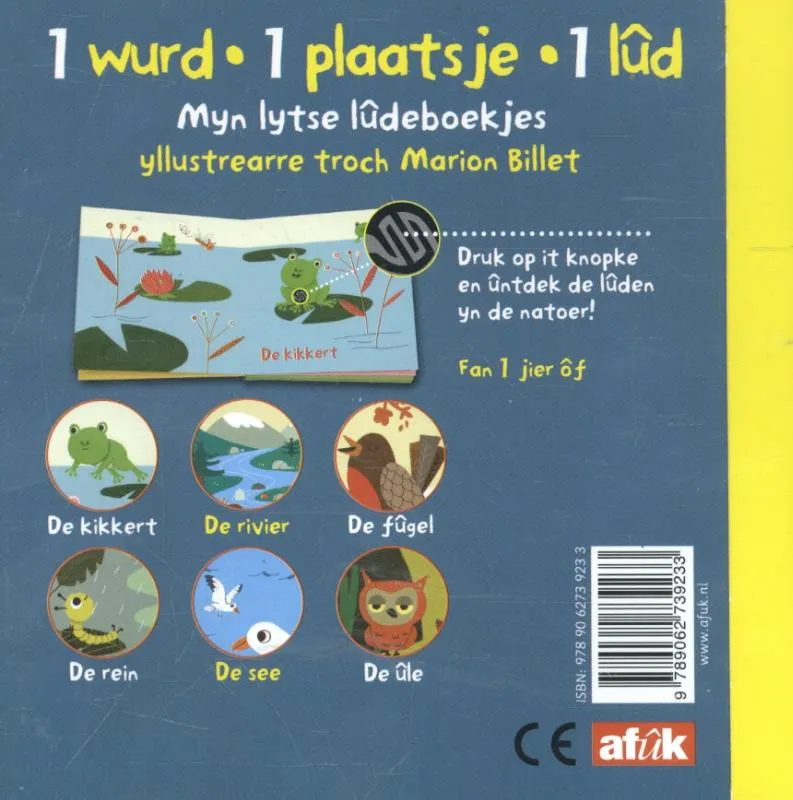 Stevich kartonboekje foar pjutten mei lûden dy’t de platen ta libben bringe. Druk op de knopkes en ûntdek de lûden út de natoer… Hoe klinkt bygelyks de see en watfoar lûd makket de kikkert?