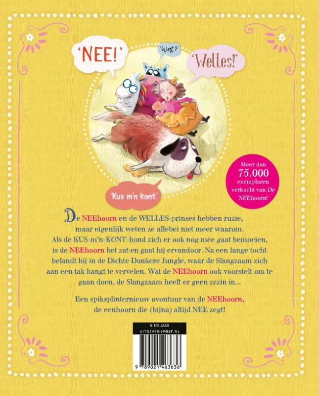 Ruzie in het Heerlijke Hartenwoud?! De NEEhoorn zegt nog steeds NEE en hij heeft ruzie met de WELLES-prinses. Alleen… weten ze allebei niet meer waarover het gaat. Als de KUS-m’n-KONT-hond het allemaal wel even denkt op te lossen, wordt het de NEEhoorn te veel en gaat hij ervandoor. Na een lange wandeling belandt hij in de dichte, donkere jungle waar de Slangzaam zich ontiegelijk aan een tak hangt te vervelen. Welk avontuur de NEEhoorn ook voorstelt, de Slangzaam heeft er geen sssin in…