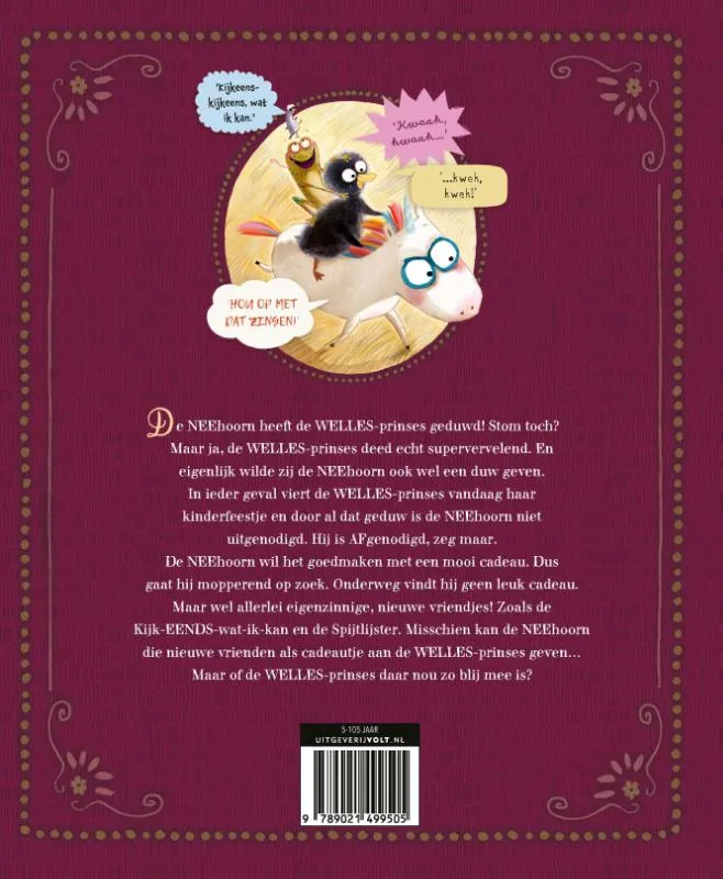 De NEEhoorn wil het goedmaken met een mooi cadeau. Dus gaat hij mopperend op zoek. Onderweg vindt hij geen leuk cadeau. Maar wel allerlei eigenzinnige, nieuwe vriendjes! Zoals de Kijk-EENDS-wat-ik-kan en de Spijtlijster. Misschien kan de NEEhoorn die nieuwe vrienden als cadeautje aan de WELLES-prinses geven… Maar of de WELLES-prinses daar nou zo blij mee is?